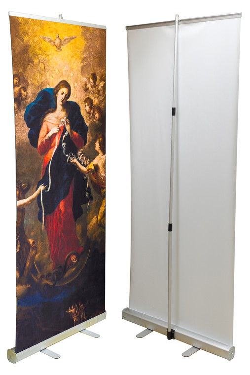 This banner stand is 78" tall by 33" wide and features the image of Mary Undoer of Knots.  Fully retractable and stored in an aluminum case, it takes less than a minute to extend the telescopic pole and unroll the Mary Undoer of Knots banner.  Each unit includes a nylon travel bag for storage and transport, making the banner stand an excellent tool for priests, professors, and missionaries who travel and spread devotion to the Blessed Virgin Mary and renewal of the family.
