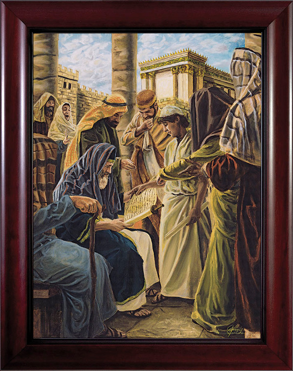 This charming rendition of the familiar Gospel tale is by contemporary Catholic artist Jason Jenicke. Our image comes as a fine art print in a solid wood frame. Handcrafted in Steubenville, Ohio, this beautiful depiction of the Finding in the Temple is sure to be treasured for generations to come!