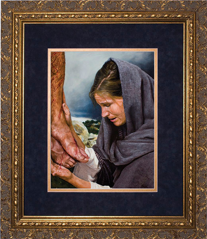 This moving depiction of Mary's Sorrow as she holds the feet of the crucified Christ is by contemporary Catholic artist Jason Jenicke. Our image comes as a fine art print double-matted in deep blue suede over gold in an ornate gold solid wood frame. Handcrafted in Steubenville, Ohio, this touching image of Mary's Sorrow is sure to be treasured for generations to come!