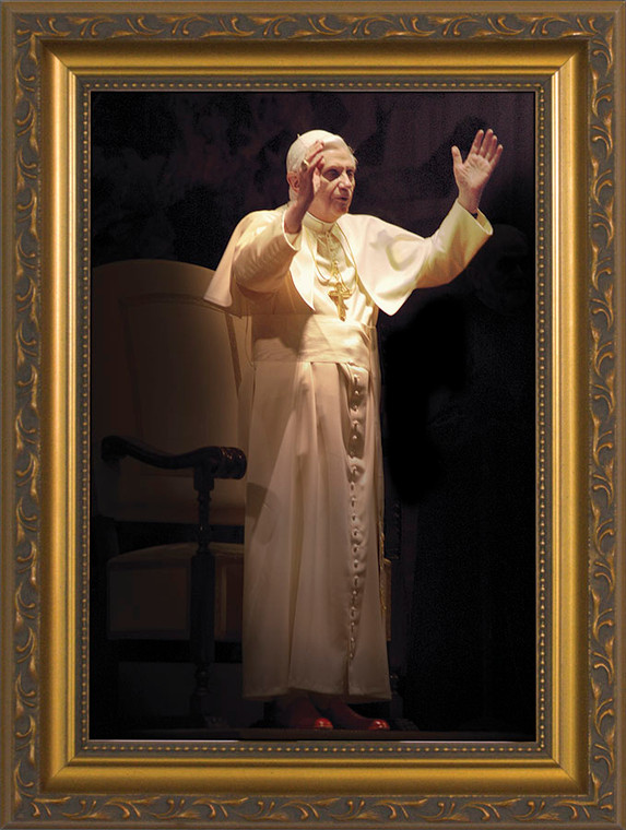 Enrich your home or parish with this quiet portrait of Pope Benedict in blessing. Handcrafted in Steubenville, Ohio, our image comes as a fine art print in an attractive gold solid wood frame. Proclaim your faith and proudly display this reminder of our beloved Papa Ben, the head of Christ's Church on earth.