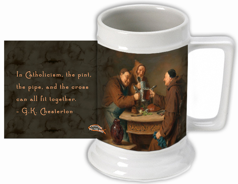 Enjoy your own personal pint in this unique ceramic G.K. Chesterton Quote Beer Stein! This stein makes a great gift to a family member or friend who is a Chesterton follower or for yourself. In true Chesterton form, this stein has a painting of monks enjoying a jovial pint of mead on one side, while G.K.'s Quote, "In Catholicism, the pint, the pipe and the cross can all fit together," is imprinted on the back.