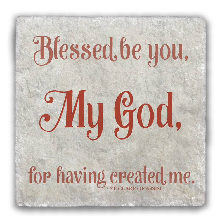 This tumbled stone tile features a quote from St. Clare, "Blessed be you, my God, for having created me".