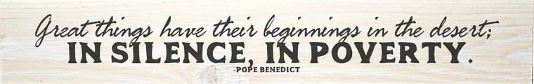 This Catholic quote plaque features the words of Pope Benedict XVI in his writing "Journey to Easter": "Great things have their beginning in the desert; in silence, in poverty".