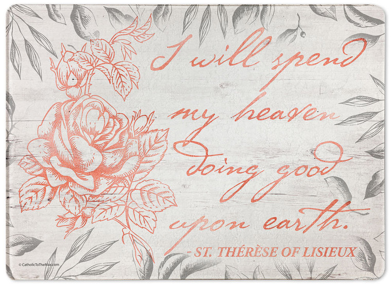 This I Will Spend my Heaven" Rectangular Glass Cutting Board features a quote from St. Therese of Lisieux, "I will spend my heaven doing good upon earth".