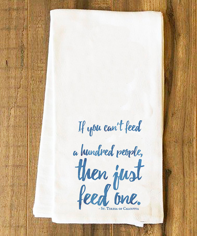Clean and beautify the domestic church with these Catholic tea towels! This Just Feed One Tea Towel will help encourage us to do good, and humble us so that we keep things in perspective.
