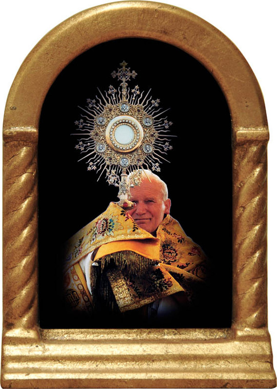 Our Pope John Paul II desk shrine is the perfect meditative and devotional gift of choice. With its beautiful imagery and elegant white marble or gilded gold leaf finish, this Pope John Paul II desk shrine will adorn your home for years to come.
