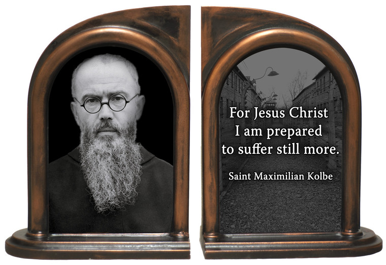 These alabaster bookends feature St. Maximilian Kolbe. Able to keep heavy books in line, they both organize and decorate your home. This pair of bookends makes the perfect personal gift for everyone with a devotion to this great martyr and saint who loved Jesus, Mary, and those around him even in the face of torment and death at the hands of the Nazis.
