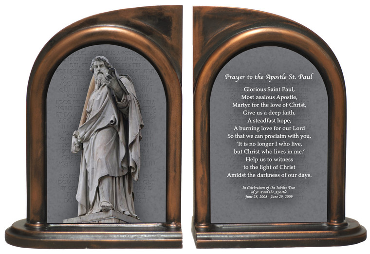 Alabaster bookends honor the apostle, preacher and convert St. Paul with an image of his famous statue outside the Vatican. Keeping heavy books in line, these bookends both organize and decorate your home. This pair of bookends makes the perfect personal gift for all converts, ministers, and anyone with a devotion to this great saint.