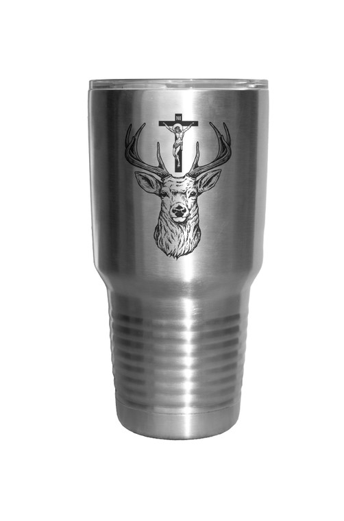 Built to take with you anywhere you go, this 30oz insulated tumbler features a deer with the Crucifix above it.