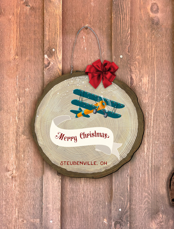 This aluminum door hanger is cut in the shape of a log end. It is painted with an airplane flying a banner with the words "Merry Christmas" in red. If you have a unique design in mind, call or email us! All of our door hangers are cut from 1/8" thick aluminum composite sign material, and printed with UV and weather-resistant ink to provide you with a full color image that prevents fading and scratching for years to come! (Ribbon not included)