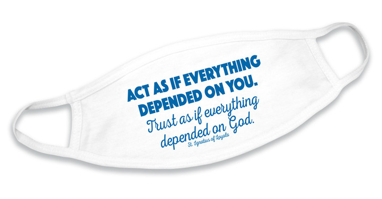 This face mask features the quote from St. Ignatius of Loyola that reads, "Act as if everything depended on you. Trust as if everything depended on God.".