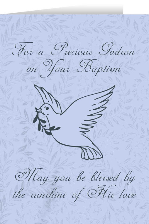 Greet the next little boy in the Body of Christ with our Godson's Baptism Dove Greeting Card! In a soft undertone of blue with branches curling about a peace-bearing dove, the cover reads, "For a precious Godson on your Baptism. May you be blessed by the sunshine of His love." Remind yourself and the new "little Christ" what the power of Baptism holds: a transformation into Christ, a life in Christ's peace.