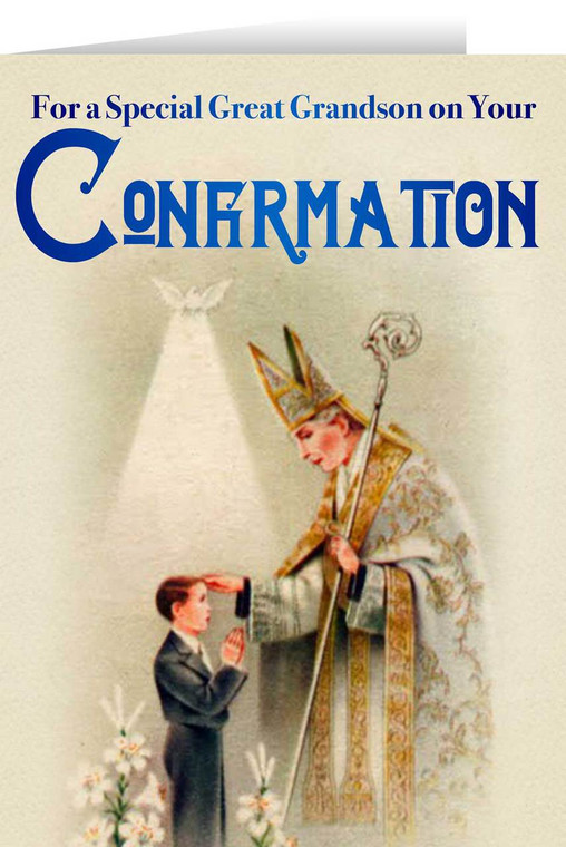 Send blessings to the newly Confirmed soldier of Christ with our Great Grandson's Confirmation Greeting Card! The front depicts a Bishop anointing a young, pious lad and the Holy Spirit as a dove pouring grace out upon him. Lilies surrounding the boy symbolize the great purity and ardency with which the boy receives the Sacrament. Remind yourself and the fully empowered soldier of the great responsibility Confirmation bears but also of the great glory that it is to be "sealed" by the Holy Spirit.
